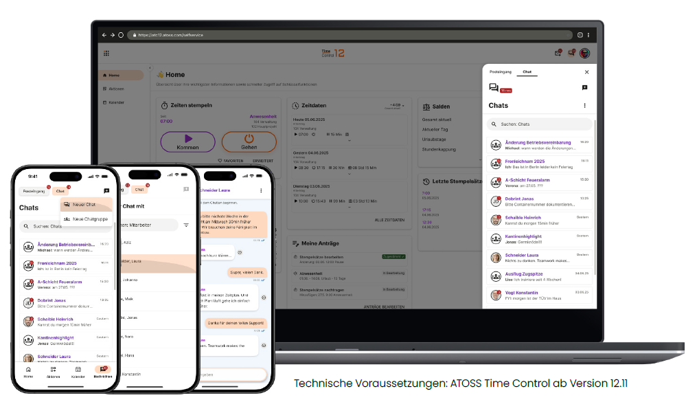 Der neue Chat in ATOSS Time Control ist ein leistungsstarkes Werkzeug, welches gängige Chatfunktionen enthält, um eine einfache und intuitive Nutzung zu ermöglichen. Durch die umfassenden Funktionen wird dadurch die zeitnahe Abstimmung bei kurzfristigen Bedarf erleichtert und wertvolle Zeit gespart.
